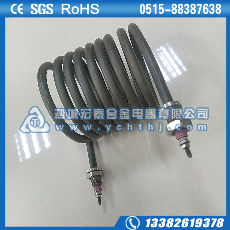 管状电热元件由金属管、螺旋状电阻丝及导热性好、绝缘性好的结晶氧化镁粉等组成。可以对系统进行加热的产品。电加热管选用优质国产厚壁无缝不锈钢管、美国进口高温氧化镁粉及封口材料,使电热管耐温达900℃,电热管在暂时脱水状态下干烧不会损坏;并采用气氛保护发黑网带炉经1060℃高温渗氮处理工艺,提高了电热管的耐高温和耐腐性,确保使用寿命 。加热管是在无缝金属管内(碳钢管、钛管、不锈钢管、铜管)装入电热丝,空隙部分填满有良好导热性和绝缘性的氧化镁粉后缩管而成,再加工成用户所需要的各种型状。它具有结构简单,热效率高,机械强度好,对恶劣的环境有良好的适应性。它可用于各种液体和酸碱盐的加热,同时也适应低溶点的金属加热溶化(铅、锌、锡、巴氏合金)